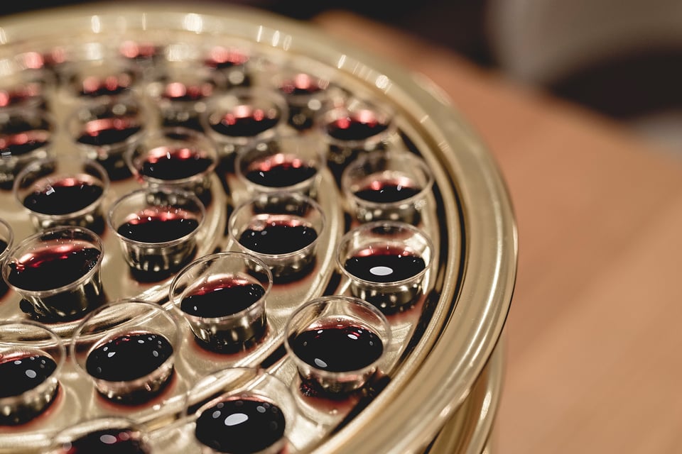 After the bread is eaten, the elder will transition to the symbolism of the wine. After reading scriptures on the significance of Christ’s shed blood, the elder will say a prayer over the wine, which has been poured into small glasses in a tray. Then he will have the ushers pass around the tray. Members will each take a glass, and as they drink the small sip of wine, they will think about how Christ shed His blood for our sins.
